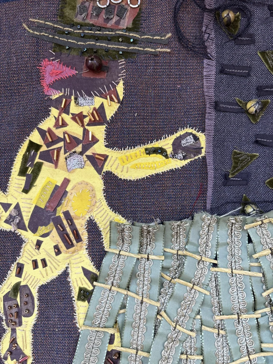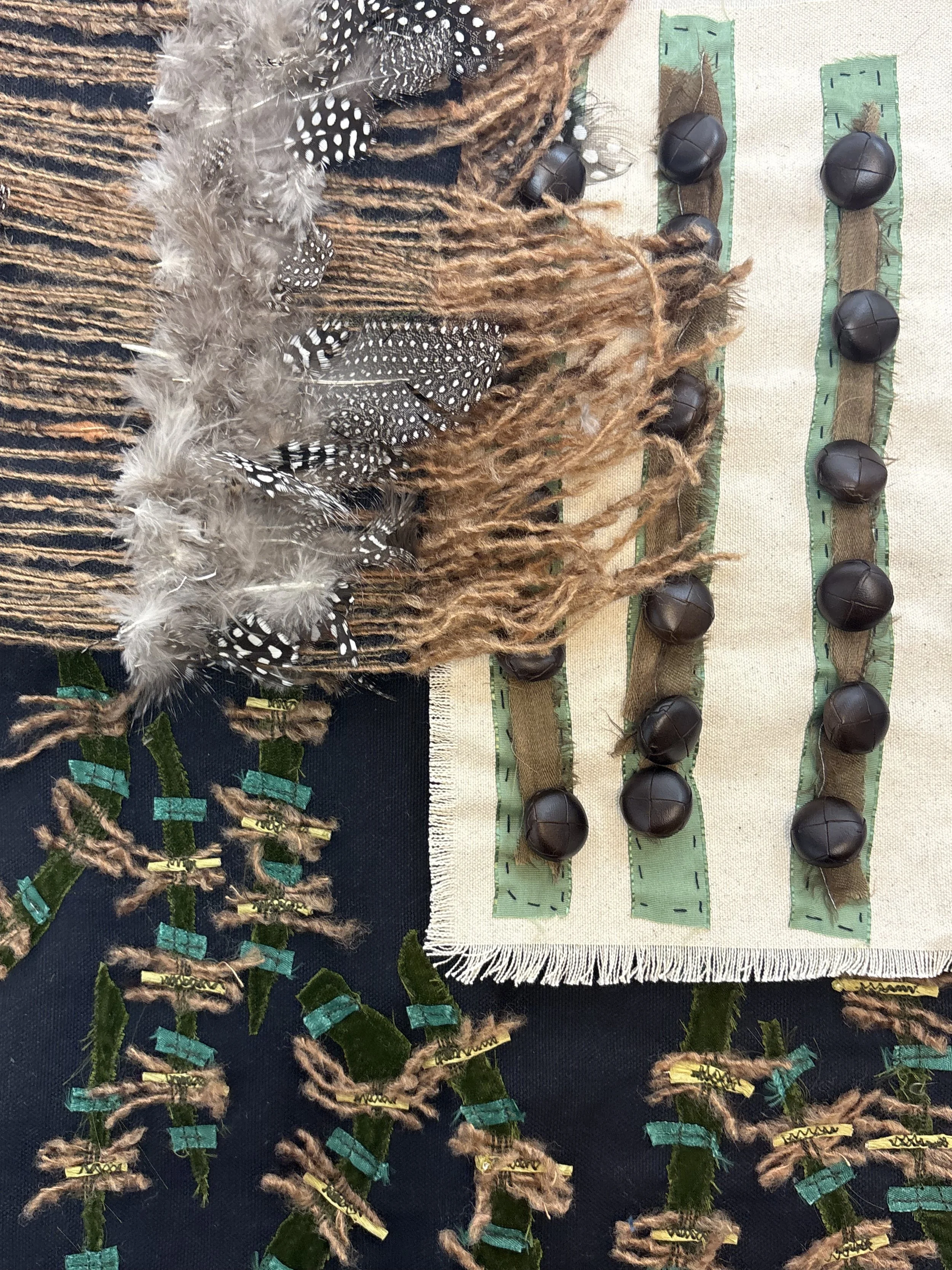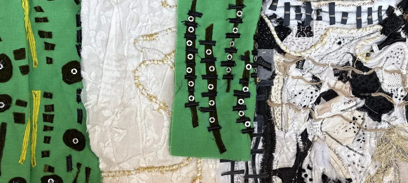 Fashion and accessory samples are presented in curated compositions such as tryptics, reimagining symbolic motifs through hand and machine embroidery- tufting, beading and layering- to evoke memory, identity and spiritual resonance. Materials inherited from my grandfather’s garage- wires, metals, plastics, hardware, along with donated glass, handmade buttons, and found objects, embed familial narrative and sustainability. Each sample focuses on reflective design and heritage. This project is of personal significance, where the samples are intended as one-off keepsakes of lasting emotional significance that honour individuality and memory . This additional portfolio project explores Catholic deity dress through the lens of relic collections and traditional Catholic art, reimagining these influences in a contemporary context. Drawing from the iconography and symbolism embedded in ecclesiastical garments and sacred objects, I focus on crafting multifunctional headdresses and body accessories. I looked closely at traditional mitres, caps, and nuns’ headdresses, developing a more accessible, modern interpretation that reimagines their traditional silhouettes for contemporary wearers. Employing bricolage techniques and intricate beadwork, each piece becomes both an artefact and a wearable sculpture. This work extends my ongoing investigation into the intersection of heritage, spirituality, and contemporary textile design, offering a tactile narrative that bridges the historical and the modern, the devotional and the expressive.