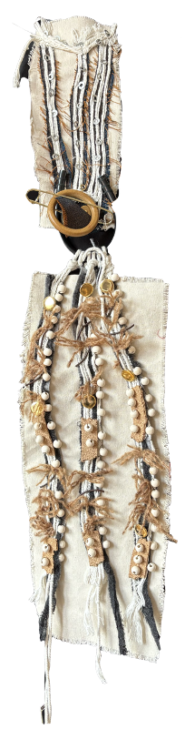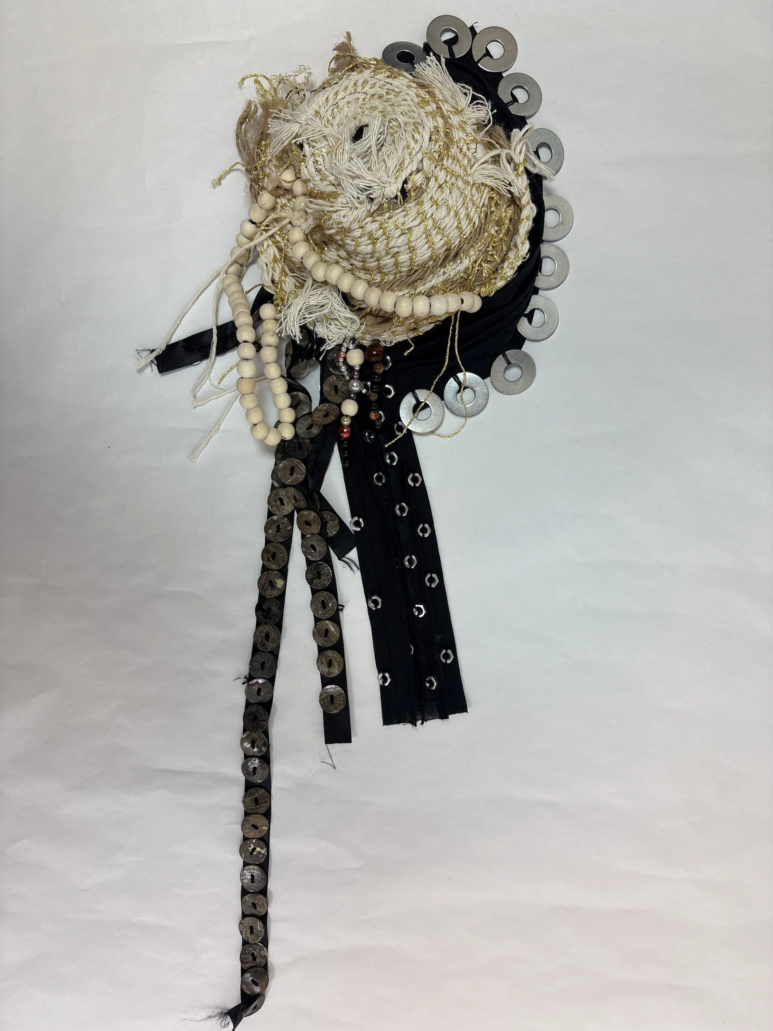 This additional portfolio project explores Catholic deity dress through the lens of relic collections and traditional Catholic art, reimagining these influences in a contemporary context. Drawing from the iconography and symbolism embedded in ecclesiastical garments and sacred objects, I focus on crafting multifunctional headdresses and body accessories. I looked closely at traditional mitres, caps, and nuns’ headdresses, developing a more accessible, modern interpretation that reimagines their traditional silhouettes for contemporary wearers. Employing bricolage techniques and intricate beadwork, each piece becomes both an artefact and a wearable sculpture. This work extends my ongoing investigation into the intersection of heritage, spirituality, and contemporary textile design, offering a tactile narrative that bridges the historical and the modern, the devotional and the expressive.